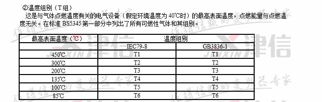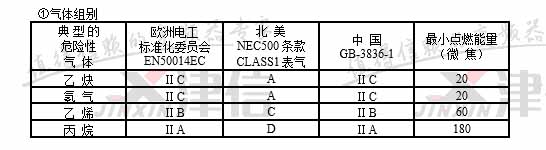 注:中國GB3836標(biāo)準(zhǔn)規(guī)定ⅡC級(jí)最小點(diǎn)燃能量為19微焦耳,ⅡA級(jí)最小點(diǎn)燃能量為200微焦耳。氣體分組和點(diǎn)燃溫度,在一定環(huán)境溫度和壓力下與可燃性氣體和空氣的混合濃度有關(guān)。